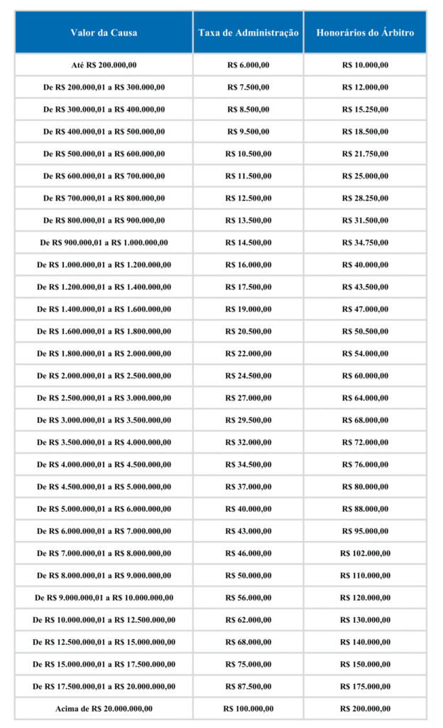 8.1. A taxa de registro, a taxa de administração, os honorários do Árbitro e as custas eventuais deverão ser pagos, no prazo determinado, por meio de boleto bancário emitido pela Câmara Local.